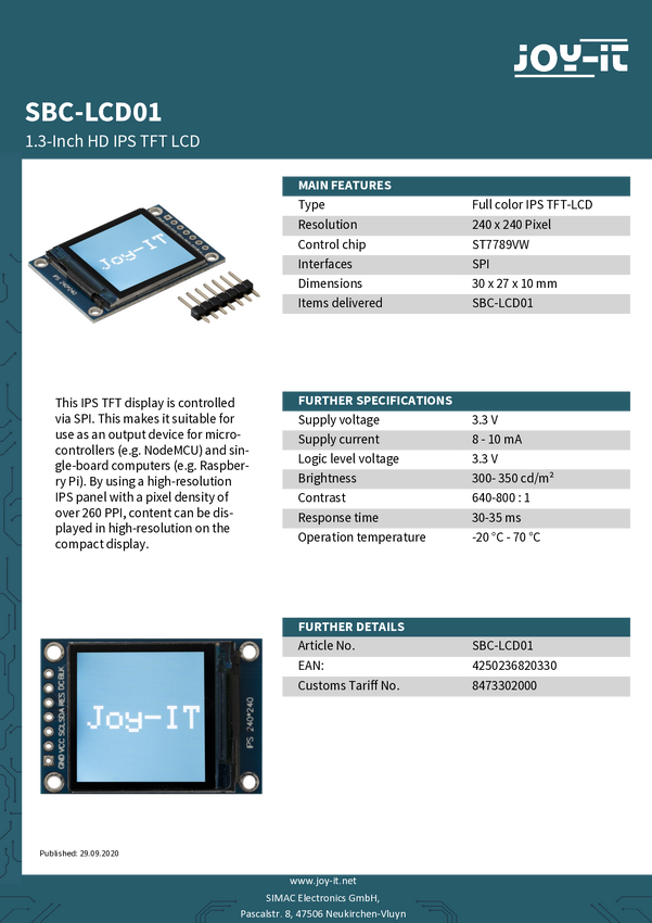 Moduł wyświetlacza Joy-it SBC-LCD01 3.3 cm (1.3 cal) 240 x 240 Pixel