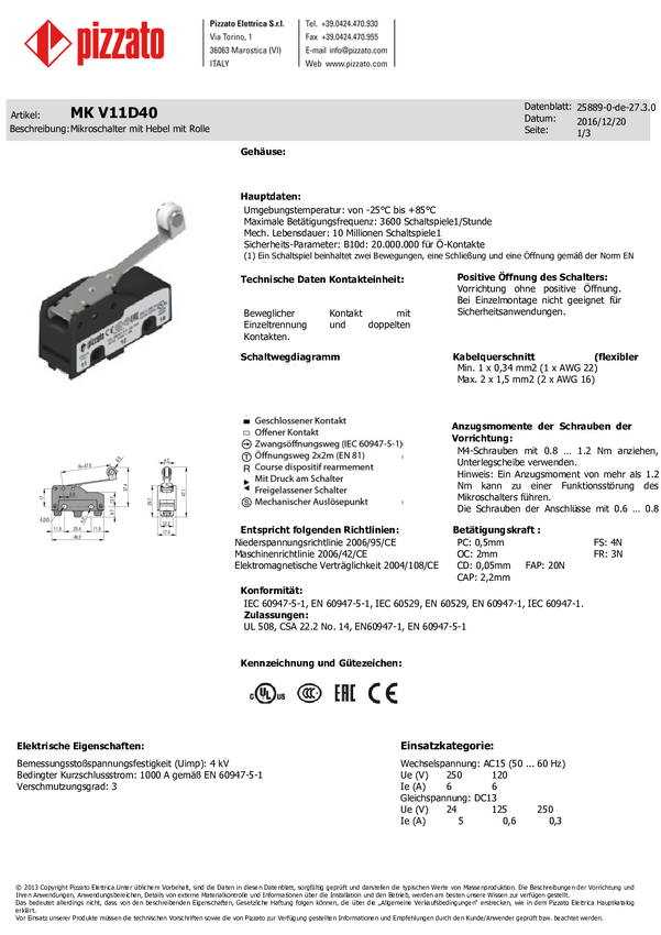 Pizzato Elettrica MKV11D40 Mikroprzełącznik MKV11D40, 1 NO, 1 NC, 250 V/AC, 6 A, 10 szt.