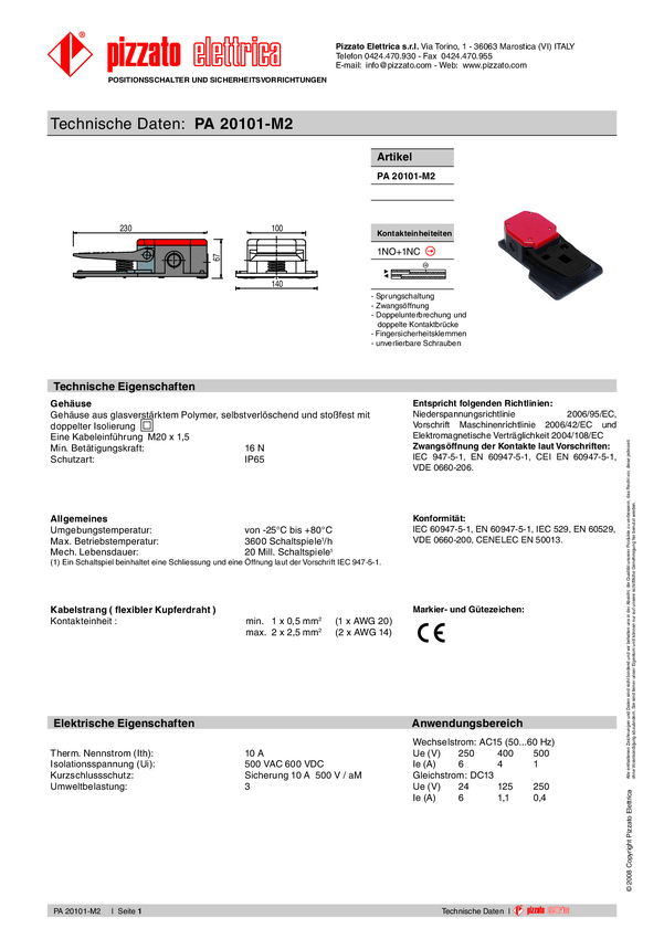 Pizzato Elettrica E2CP01S2V1 Element stykowy samomonitorujący 1 NC chwilowy 250 V/AC 10 szt.