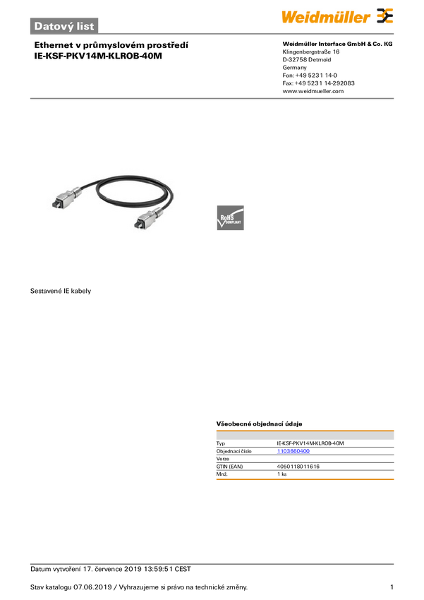 Weidmüller 1103660400 Kabel połączeniowy czujnika/aktuatora IE-KSF-PKV14M-KLROB-40M, 1 szt.