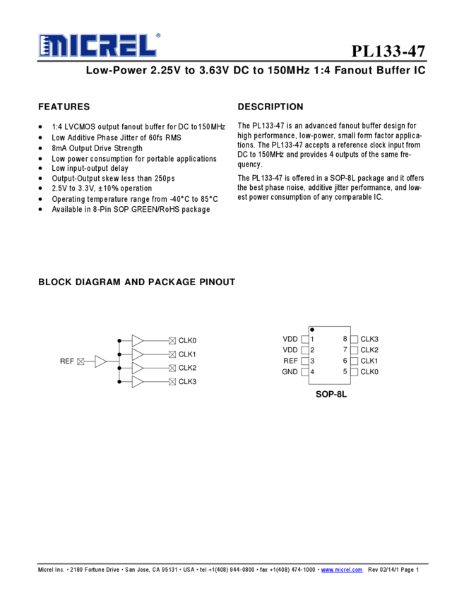 PL133-47 - Low Power 2.25V to 3.63V DC to 150MHz 1:4 Fanout Buffer IC