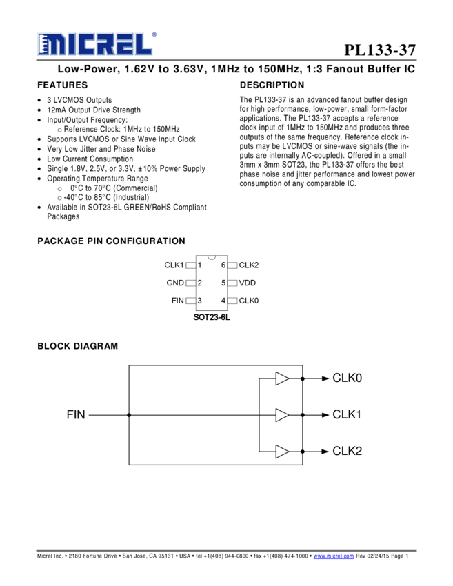 PL133-37 - Low Power, 1.62V to 3.63V, 1MHz to 150MHz, 1:3 Fanout Buffer IC