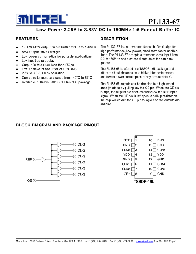 PL133-67 - Low Power 2.25V to 3.63V DC to 150MHz 1:6 Fanout Buffer IC