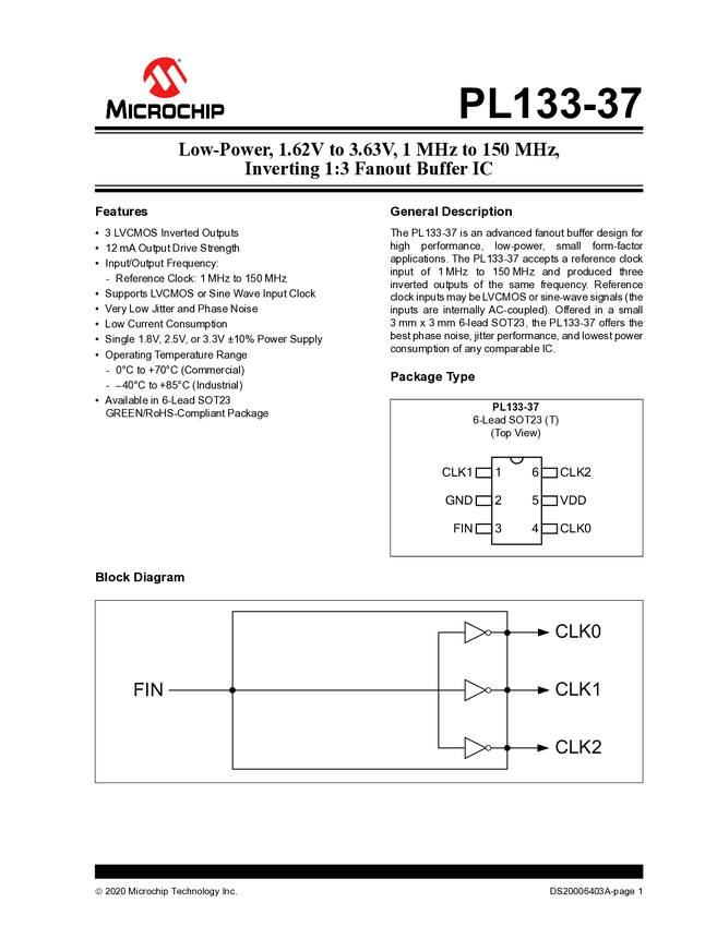 PL133-37 - Low Power, 1.62V to 3.63V, 1MHz to 150MHz, Inverting 1:3 Fanout Buffer IC