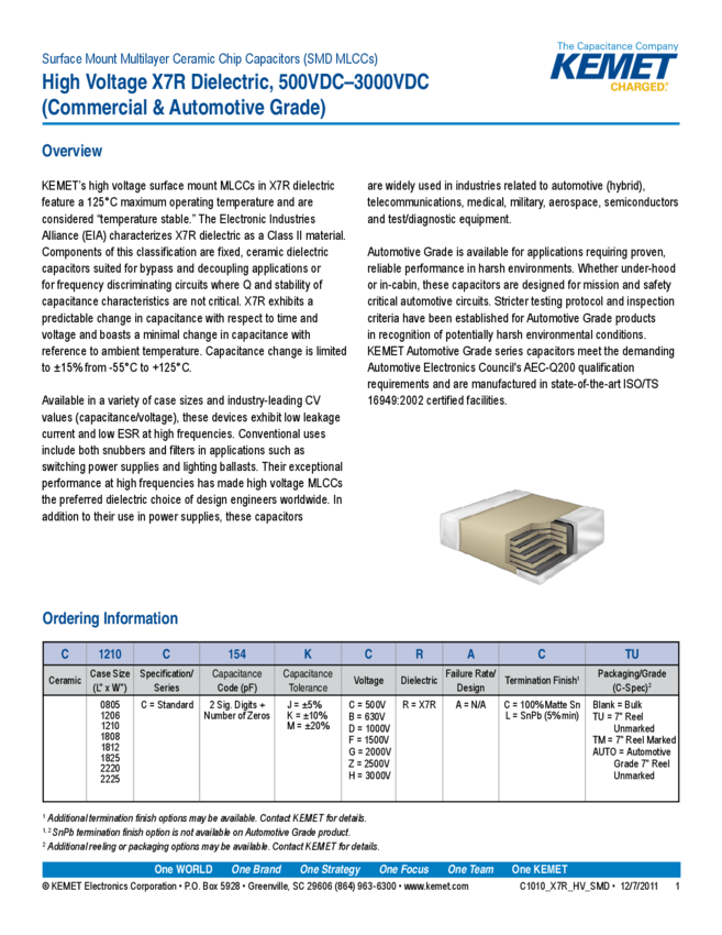 Cap Ceramic 0.0047uF 1000V X7R 10% SMD 1206 125°C Embossed Plastic T/R