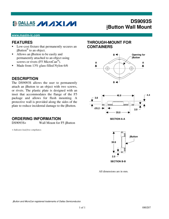 DS9093RA, DS9093RB iButton Plastic Card Mounts