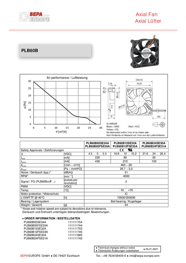 Wentylator osiowy SEPA PLB60B05SE34A, 5 V/AC, 27.6 m³/h, (D x S x W) 60 x 60 x 15 mm