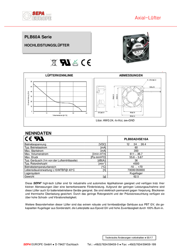 SEPA PLB60A24SE16A Wentylator osiowy 24 V/DC 36.7 m³/h (D x S x W) 60 x 60 x 25 mm