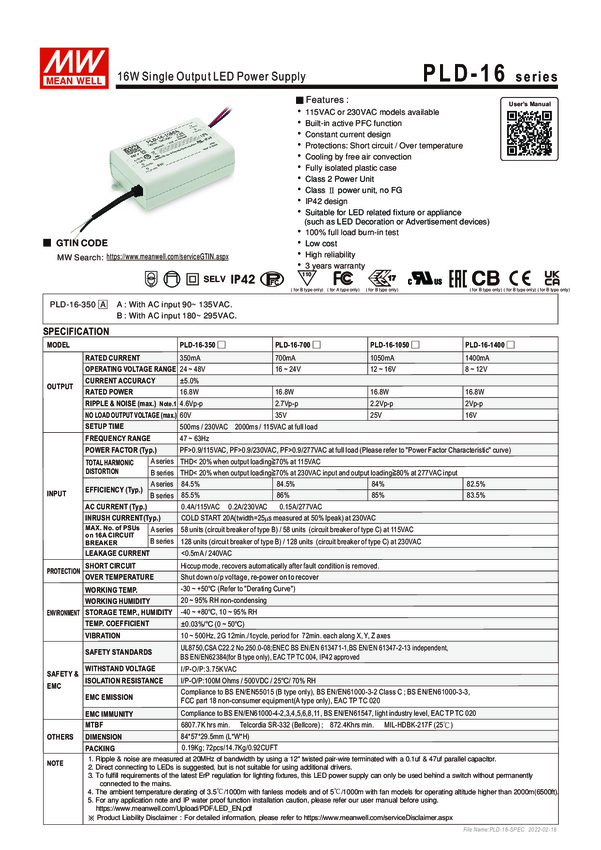 MEAN WELL PLD-16-1400B Sterownik LED Stałonaprądowy 16 W 1.4 A 8 - 12 V/DC nie nadaje się do ściemniania 1 szt.