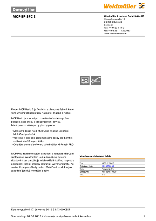 Akcesorium plotera Weidmüller MCP EP SFC 3 1058090000, 1 szt.