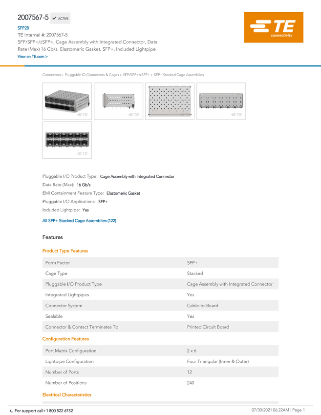 TE Connectivity TE AMP SFP+ Pluggable I/O 2007567-5, 1 szt.