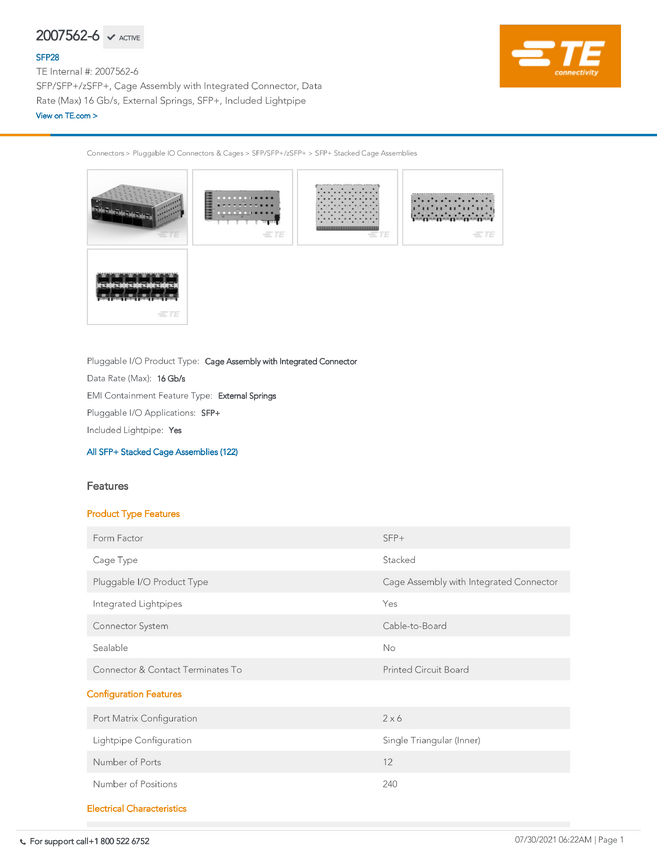 TE Connectivity TE AMP SFP+ Pluggable I/O 2007562-6, 1 szt.
