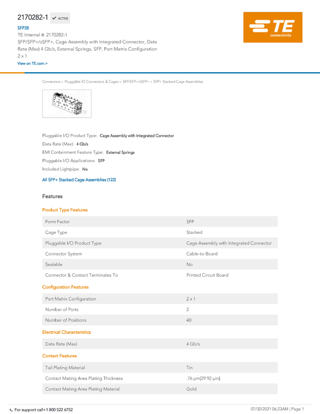TE Connectivity TE AMP SFP Pluggable I/O 2170282-1, 1 szt.