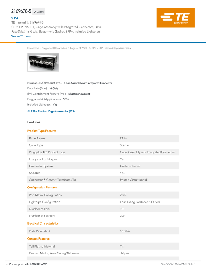 TE Connectivity TE AMP SFP+ Pluggable I/O 2169678-5, 1 szt.