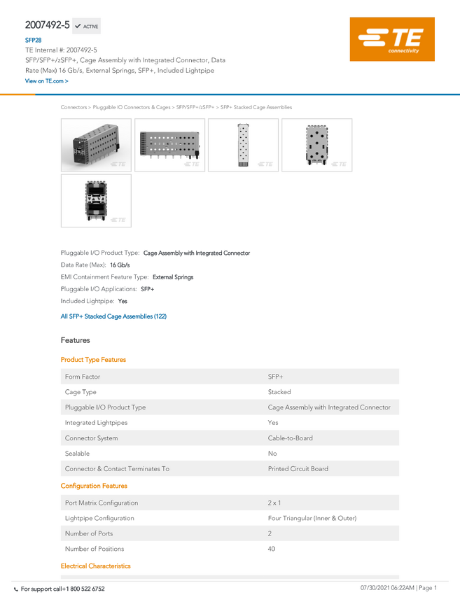 TE Connectivity TE AMP SFP+ Pluggable I/O 2169788-5, 1 szt.
