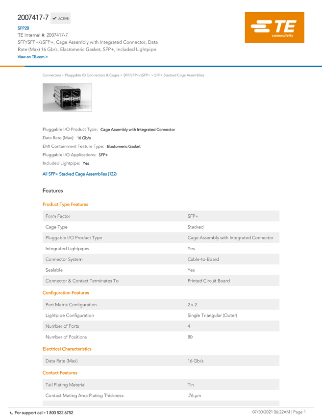 TE Connectivity TE AMP SFP+ Pluggable I/O 2007417-7, 1 szt.