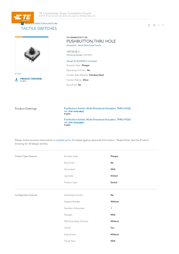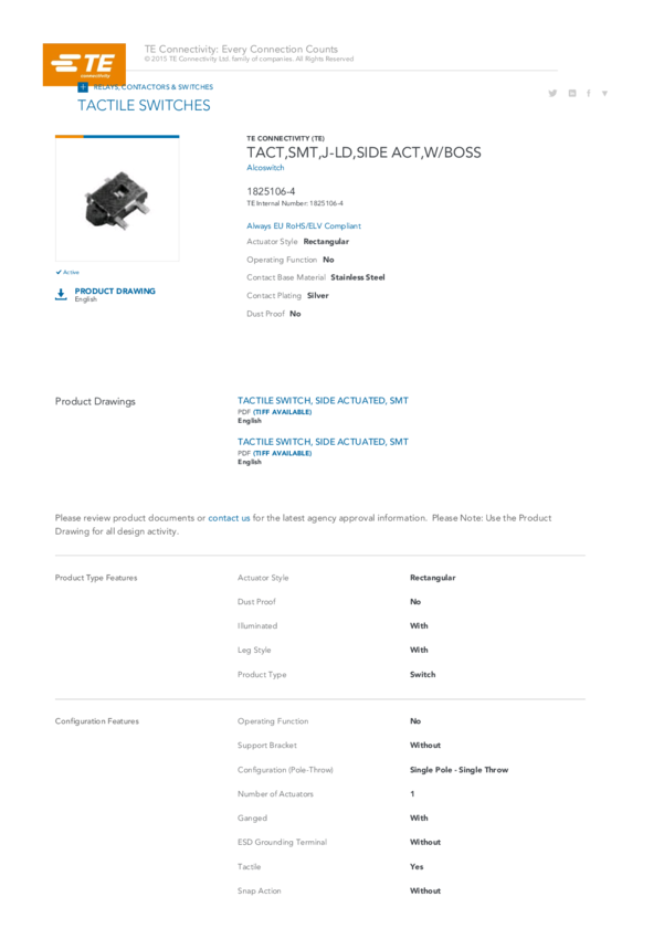 Switch Tactile OFF (ON) SPST Round Plunger PC Pins 20VAC 20VDC 0.4VA 3.92N Thru-Hole Loose Piece