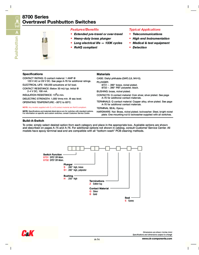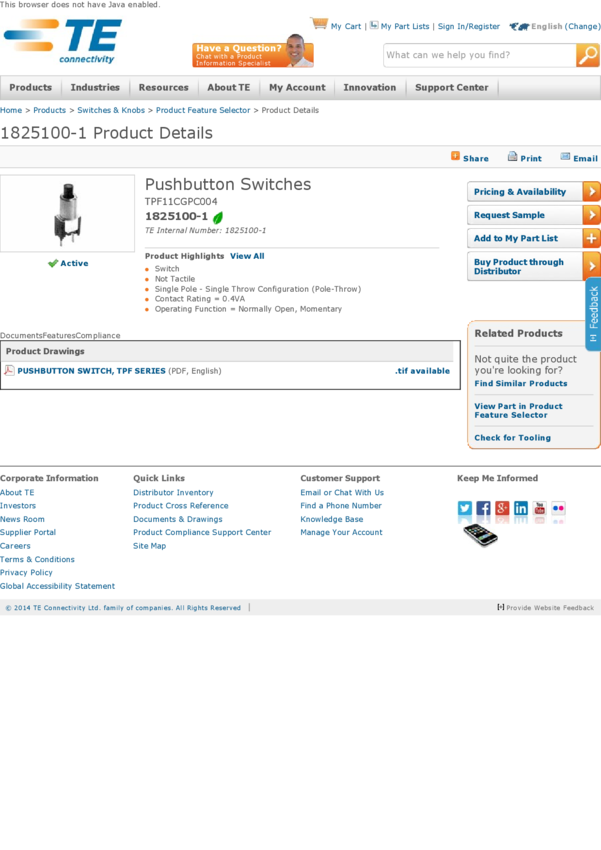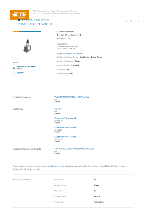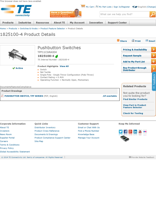 Switch Push Button N.O. SPST Round Plunger 20VAC 0.4VA Momentary Contact PC Pins Panel Mount/Through Hole Loose Piece