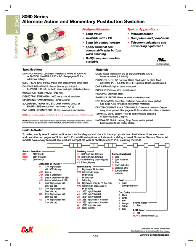 Switch Push Button ON ON SPDT Round Plunger 20VAC 20VDC 0.4VA Alternate Contact PC Pins Panel Mount/Through Hole