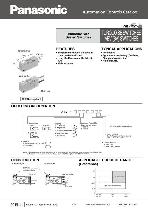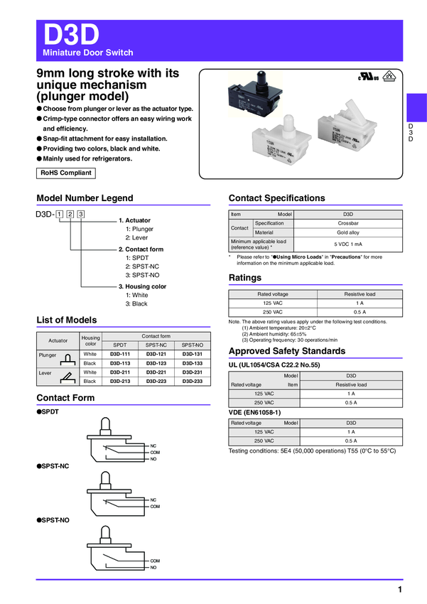 Switch Snap Action N.O./N.C. SPDT Pin Plunger PC Pins 3A 250VAC 30VDC 1.77N Thru-Hole