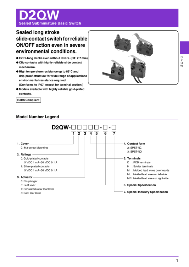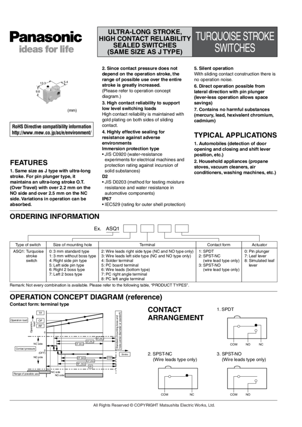 Switch Snap Action N.O./N.C. SPDT Pin Plunger Solder 0.1A 30VDC 1.47N Screw Mount