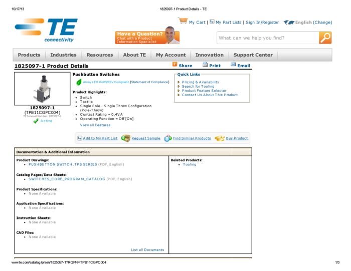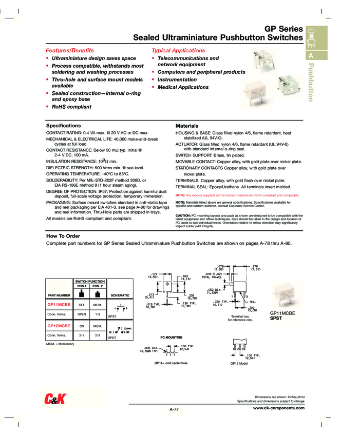 Switch Push Button ON Mom SPDT Round Plunger 20VAC 20VDC 0.4VA Momentary Contact PC Pins Thru-Hole