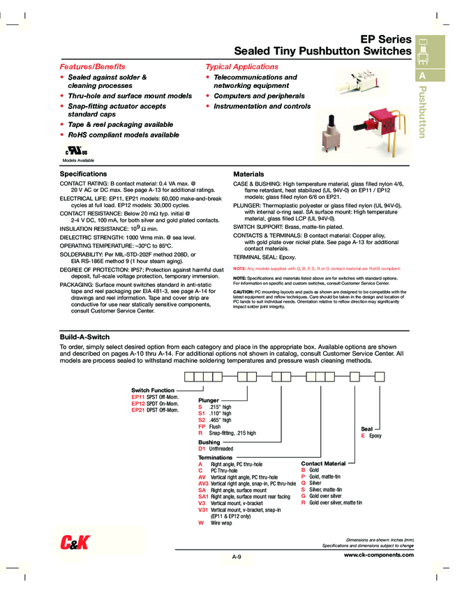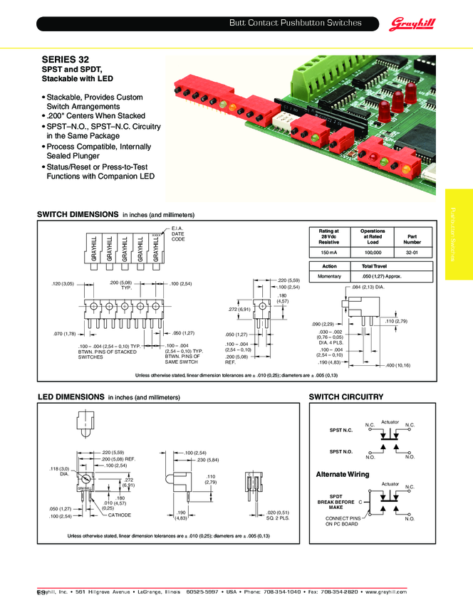 Switch Push Button N.O./N.C. SPST Round Plunger 0.15A 28VDC Momentary Contact PC Pins Thru-Hole