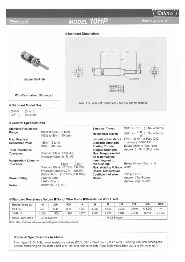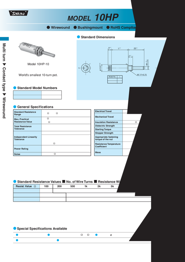 Potencjometr drutowy; bushing; 5 obrotowy; średnica 10,5mm; ośka 4mm; Produkcja firmy Sakae; na zamówienie wersje podobn e