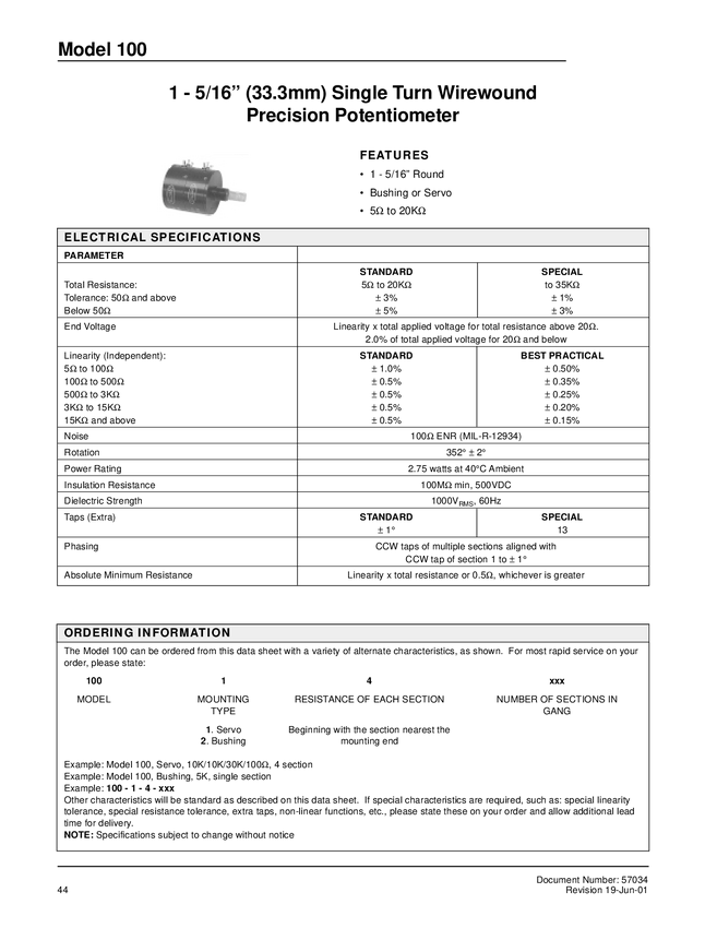 1-5/16"=33,3mm 1 obrotowy drutowy, servo Potencjometr drutowy, Servo, lin 0,5%; tol 3% 1 obrotowy, średnica 1-5/16"=33,3mm; ośka1/4"=6,35mm moc 2.75W