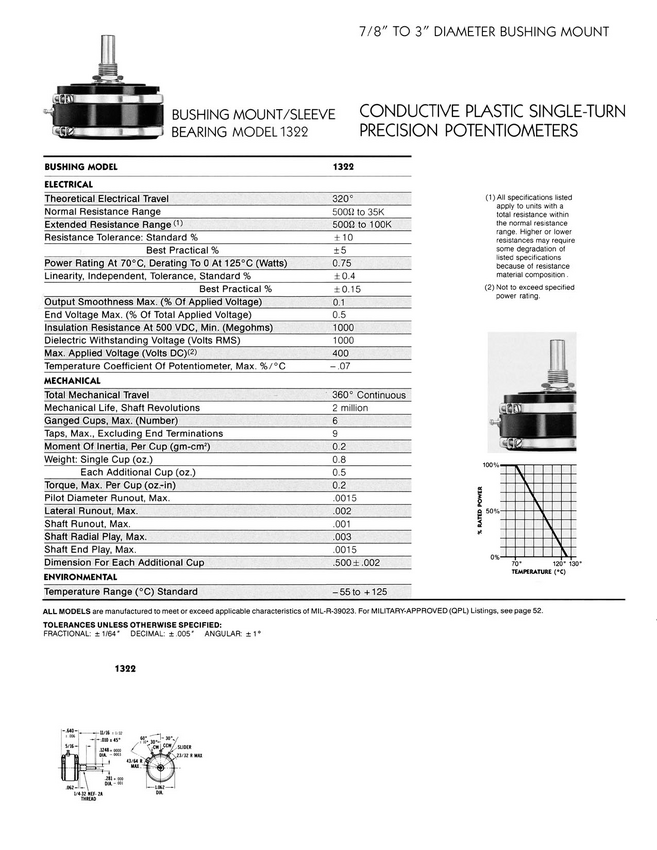 Potencjometr drutowy; Bushing 3/8-32UNEF ; średnica 1-5/16"=33,3mm gł.16mm; ośka 1/4"=6,35mm dł.22 mm trwałość 500.000 cykli; moc 2,75W; kręci się w kółko; jednoobrotowy; piny z tyłu; podobny PM6657S-1-...