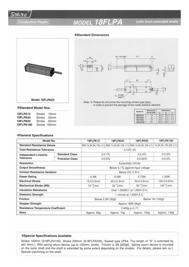 Potencjometr liniowy przew.plastyk travel 50mm; lin 0,5% dł.98mm+ ; rozstaw śr. 88mm; szer 20 z uszami 40mm; roz. śr. 30mm; wys.16+2mm; 1,5W/70 st bez.spr.por. Rezystancja.. odpowiedniki Sakae pm18flpa50.. pm18flpbc50..