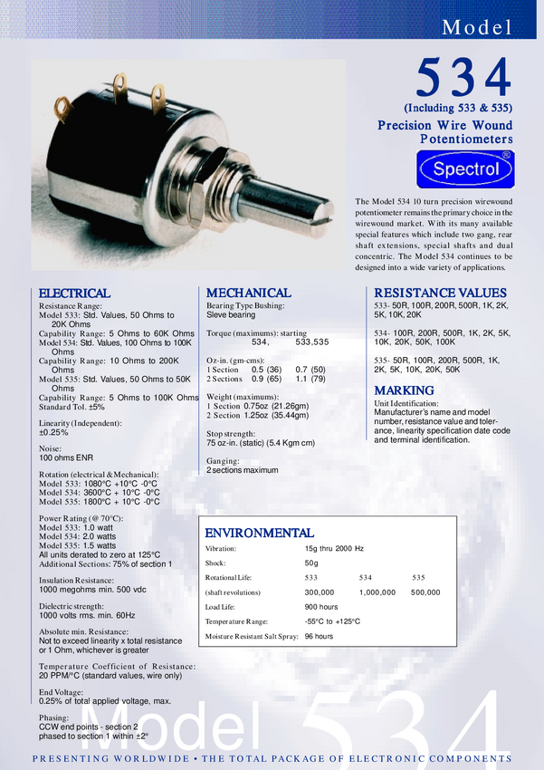 Potencjometr Servo .. rezystancja 2 kohm 10 obrotowy, średnica 0,87"x1,563"; ośka 1/8", dł.0,344" Liniowość 1%; trwałość; 2W, Spectrol Potencjometr nieprodukowany do wyczerpania magazynu dostawcy
