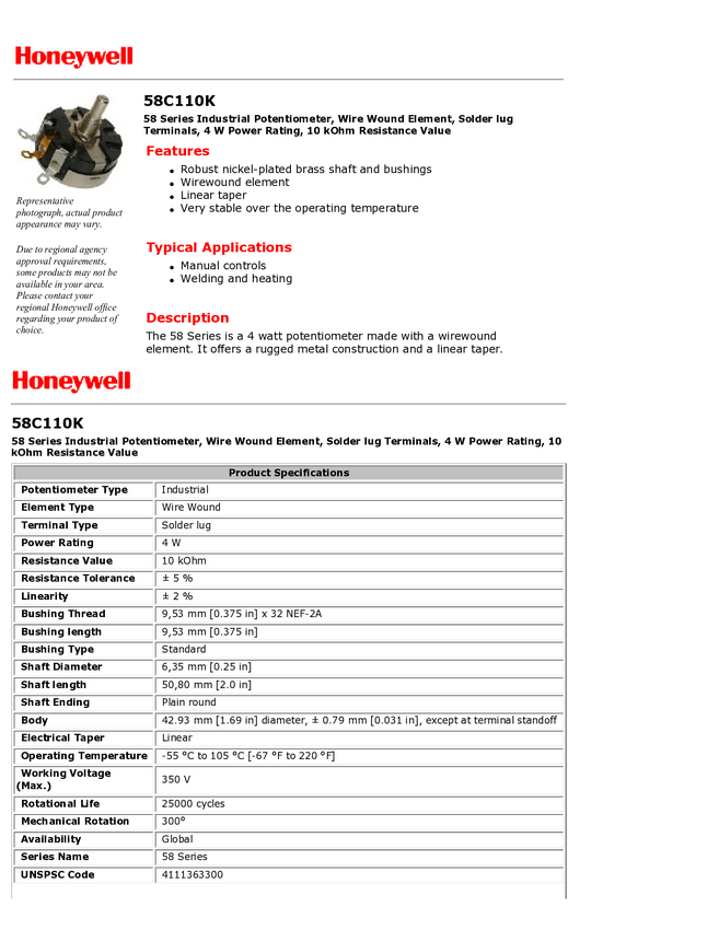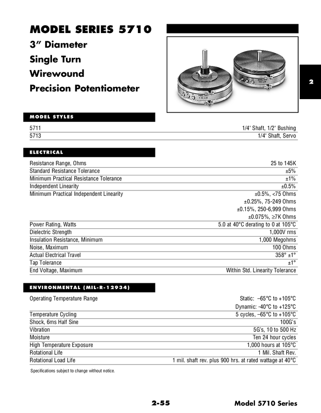 Potencjometr Drutowy - Militarna wersja modelu PM58C..; 4W; 1 obrotowy, kąt 280/300 stopni; ośka 1/4" dł. 7/8 "; Bushing -55+105 stopni; Tol.10%; średnica 1 3/32"=43mm; gł. 19,84mm trwałość 25.000 cykli rezystancja 50 ohm