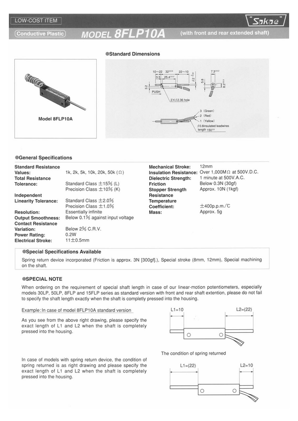 Czujnik położenia (Linear-motion Potentiometer) Przewodzący plastyk; wym:8x7mm; pomiar: 10 mm Produkcja firmy SAKAE; na zamówienie wersje podobne