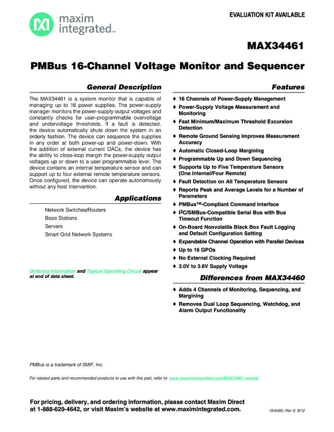 MAX34461 PMBus 16-Channel Voltage Monitor and Sequencer