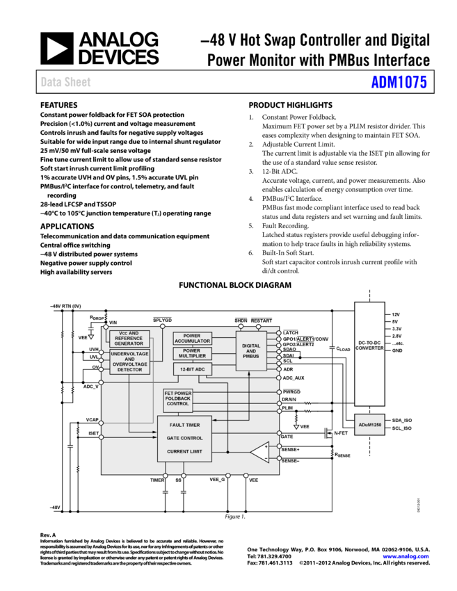 ADM1075: −48 V Hot Swap Controller and Digital Power Monitor with PMBus Interface