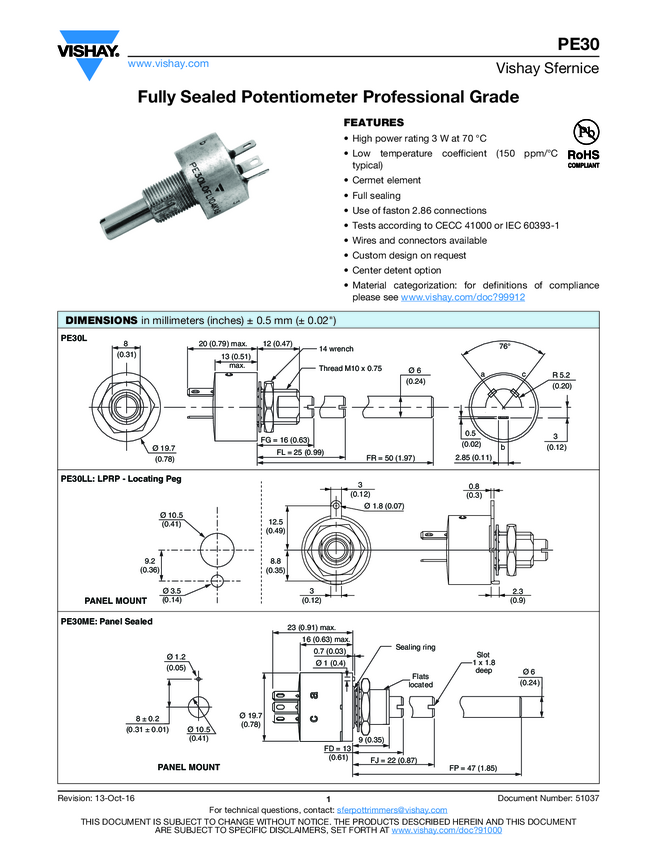 Potencjometr 2 W bushing, kąt el. 270 st; kąt mech.300 st. tol 20%; średnica 19,7mm; gł.20 mm; ośka 6,35mm; dł. ośki 22 mm; Rezystancja 1 kohm, logarytmiczny proponujemy podobne modele pmpe30..