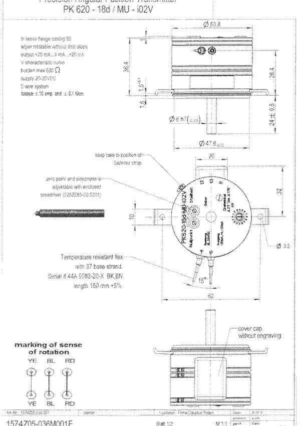 Precision Angular Position Transmitter PK620d/mu-I02C in servo fla nge casing 20 wiper rotatable without linit stops output +20mA..4m A...+20mA; V charakteristic curve burden max 600 ohm supply 20-30V DC 2 wire system version according to 0313PK torque 3/4 10cmp and 3/4 0,1 Ncm