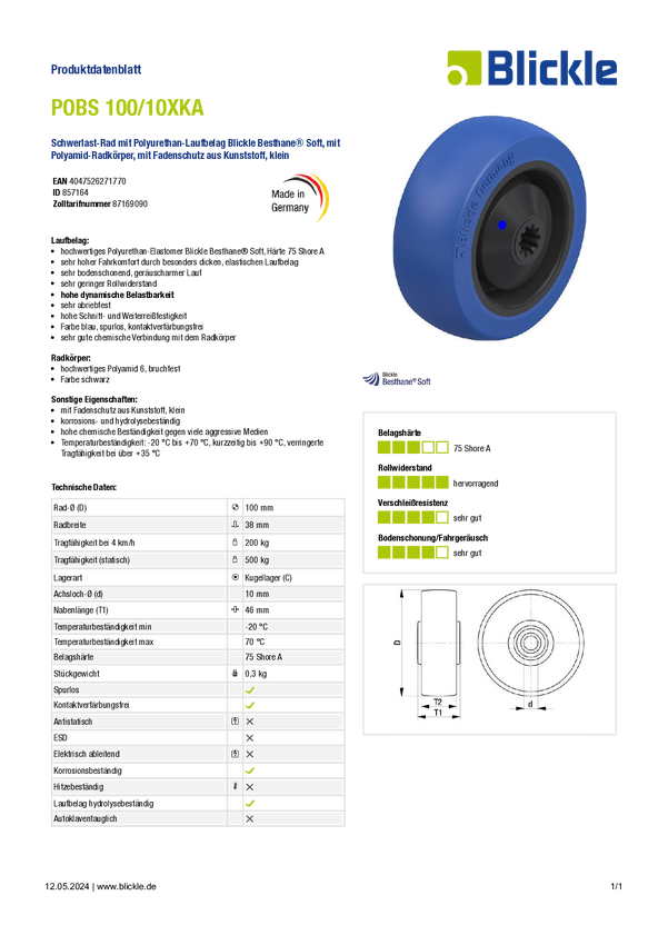 Blickle 857164 POBS 100/10XKA Koło do dużych obciążeń Średnica koła: 100 mm Maksymalne obciążenie: 200 kg 1 szt.