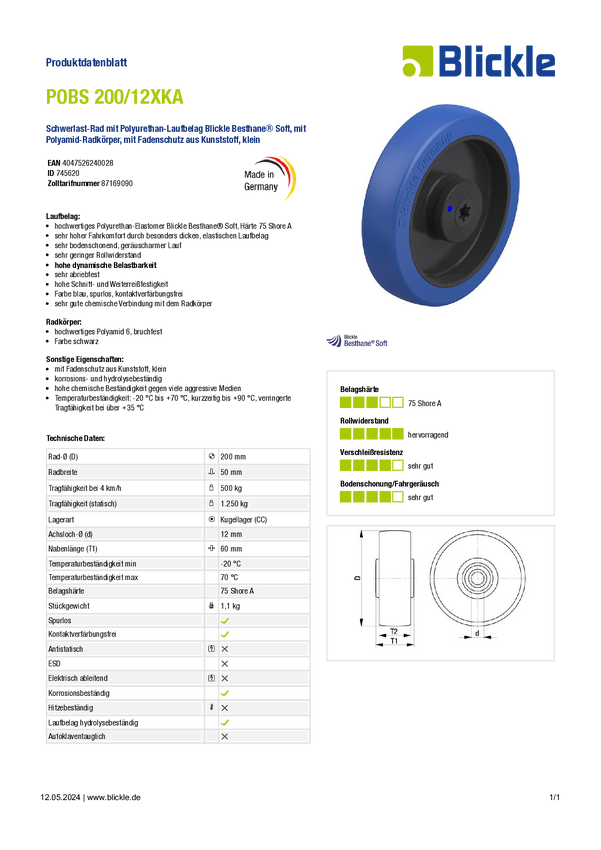 Blickle 745620 POBS 200/12XKA Koło do dużych obciążeń Średnica koła: 200 mm Maksymalne obciążenie: 500 kg 1 szt.