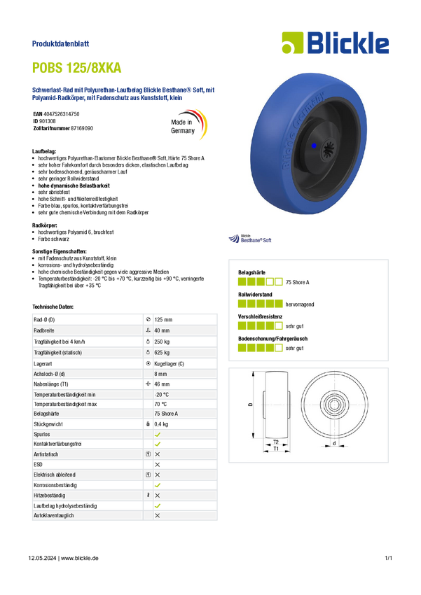 Blickle 901308 POBS 125/8XKA Koło do dużych obciążeń Średnica koła: 125 mm Maksymalne obciążenie: 250 kg 1 szt.