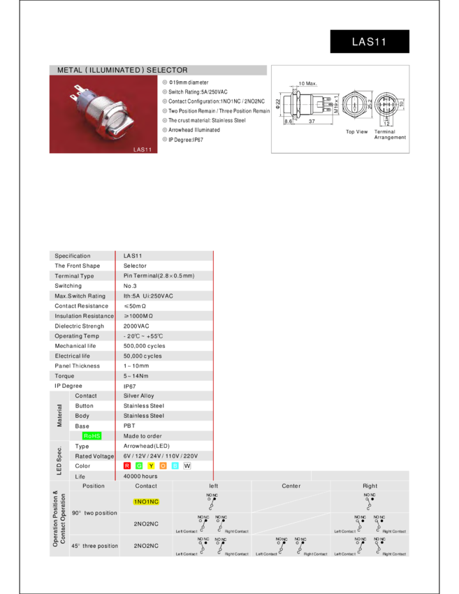 Przełącznik, , 19 mm, SW-GQLAS11B, podświetlenie , dwupozycyjny, 1NO1NC, IP67, LED6V, CE/40 szt.