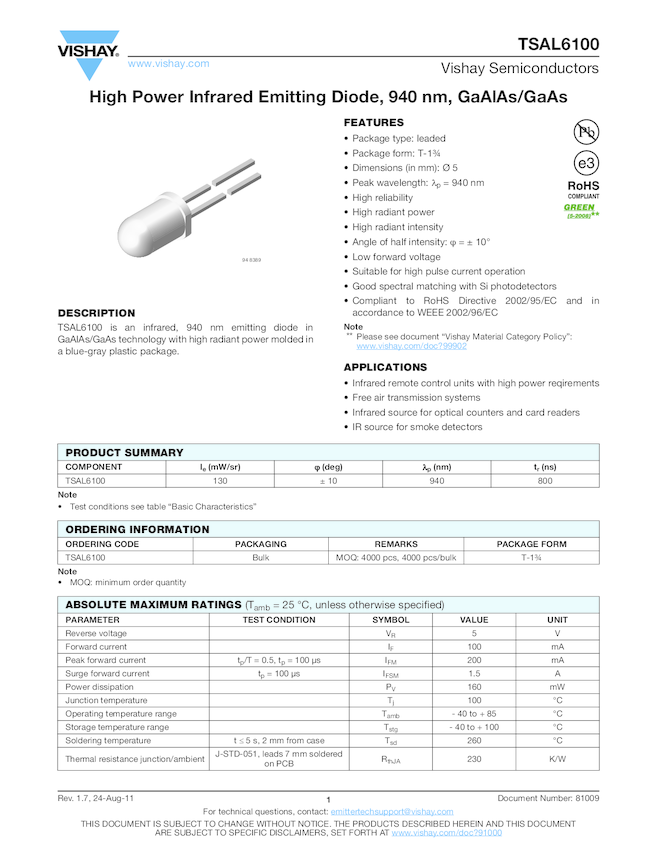 Dioda LED, nadawcza podczerwieni, InfraRed 940nm, 20mA, water clear, 120 stopni