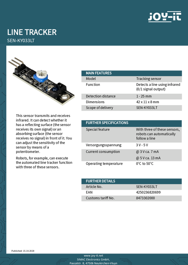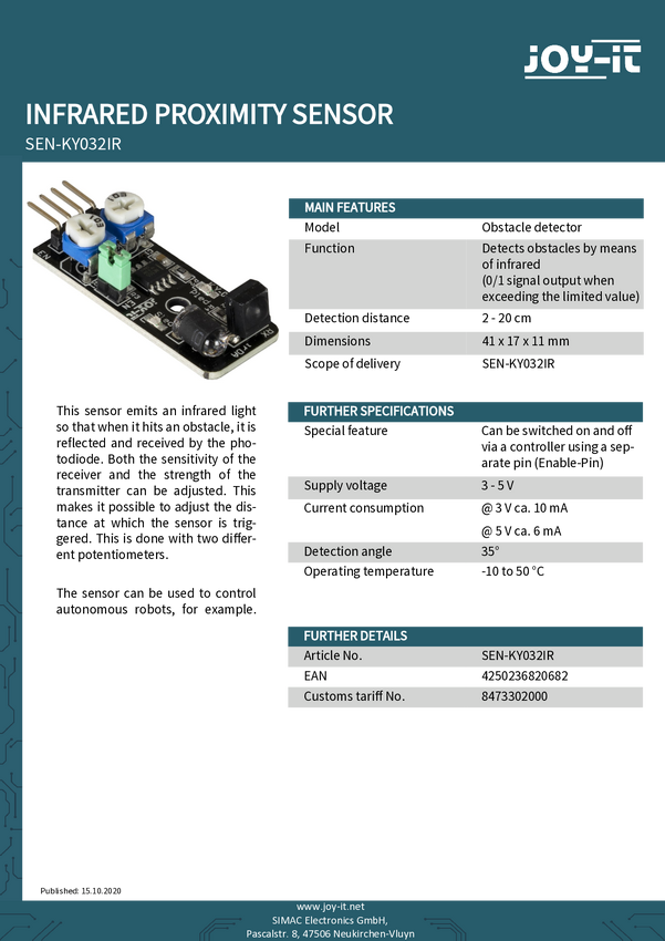 Czujnik Joy-it SEN-KY033LT Czujnik podczerwieni 1 szt.