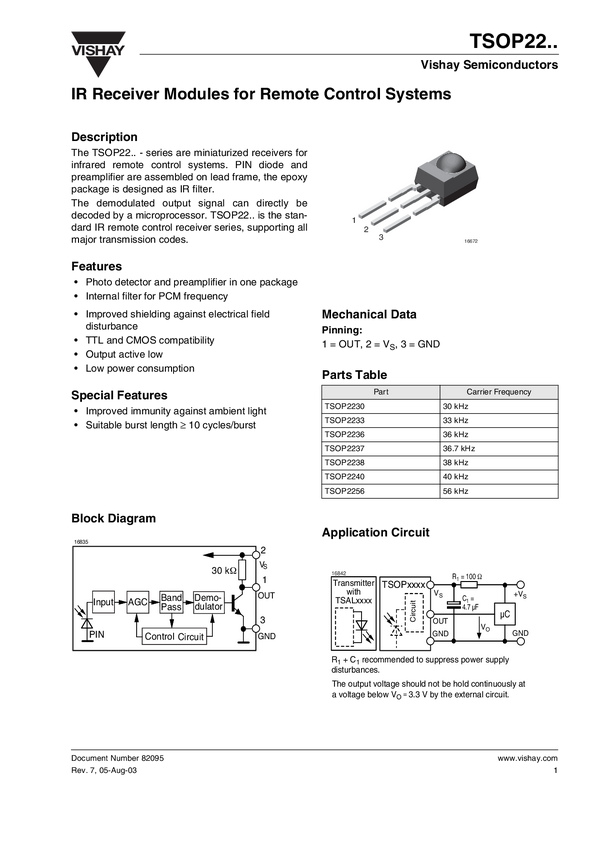 Dioda odbiorcza podczerwieni; TSOP2238; odbiornik IR; THT; dyfuzyjna; czarna; 38kHz; VISHAY; RoHS; opakowanie/100szt