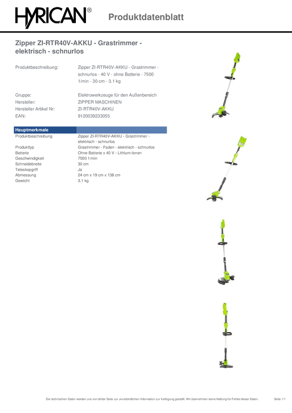 Zipper ZI-RTR40V-AKKU akumulatorowy Podkaszarka bez akumulatora 40 V Maksymalna szerokość cięcia 300 mm