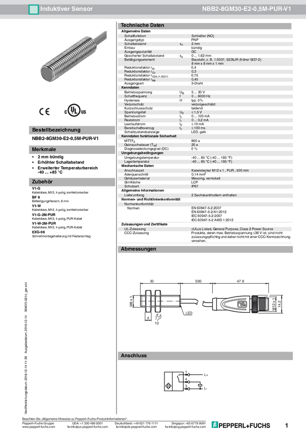 Pepperl+Fuchs Czujnik indukcyjny podtynkowy PNP NBB2-8GM30-E2-0,5M-PUR-V1