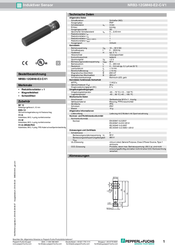 Pepperl+Fuchs Czujnik indukcyjny podtynkowy PNP NRB3-12GM40-E2-C-V1