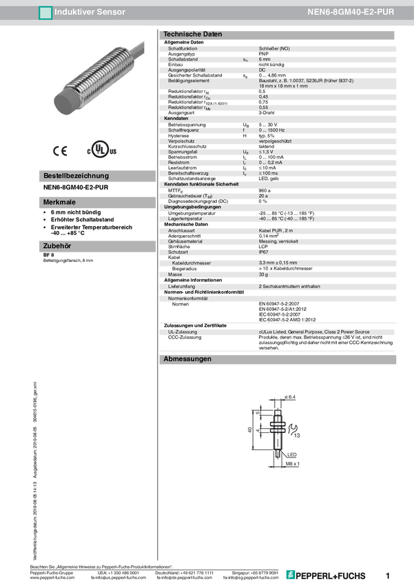 Pepperl+Fuchs Czujnik indukcyjny nie podtynkowy PNP NEN6-8GM40-E2-PUR