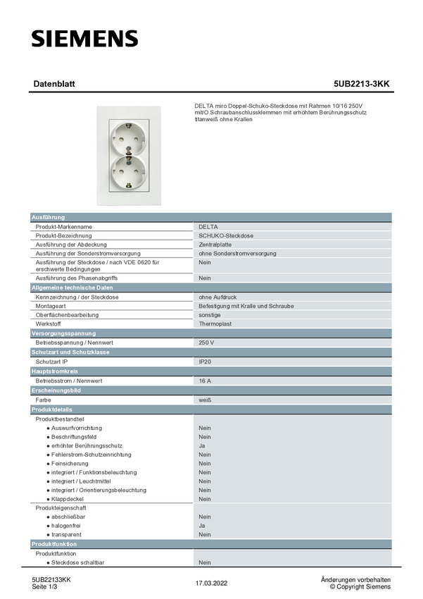 Gniazdo podtynkowe Siemens 5UB22133KK biały